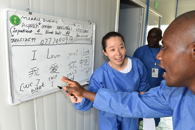 11. 17点10分,门诊区的护士利用工作间隙对当地护工开始了中文教学,“今天学习的内容是——我爱你中国!”。