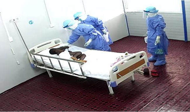 9. 11点20分,医生对留观患者进行了查房和护理。这是一个8岁的男孩(最后诊断为确诊病例),母亲因为埃博拉刚刚去世,今天仍在发热,呕吐。蒋小娟负责给患儿喂药、护理工作,用中国阿姨们的关心和他共度难关。