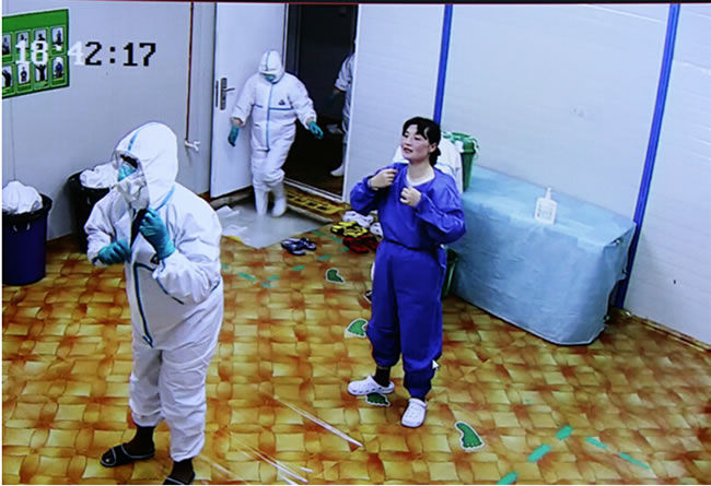 5. 9点50分,穿戴好工作服的医生,通过对讲机与埃博拉疑似患者进行问诊。通过病史询问初步判断病情、协助调查员了解患者相关的流行病学史,将患者收入留观病区。